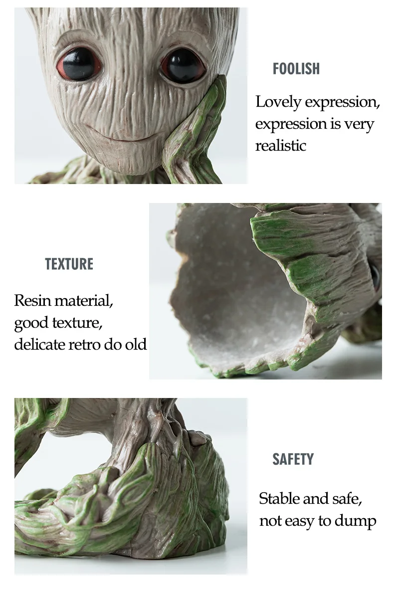1. Feito de materiais de alta qualidade, acabamento requintado.2. O modelo Galaxy Guard Treeman é redondo e agradável, e você pode colher flores e plantas em sua cabeça para tornar sua vida doméstica cheia de vegetação.3. Adequado para sala de estar, sala de jantar, quarto, estudo e muitas outras cenas.4. Embalagem segura, você receberá um bom produto.5. É presentes muito criativos da promoção e decoração home6. Plante algumas suculentas e flores para tornar seu ambiente mais vibrante.7.Groot é completamente diferente das pessoas da árvore da mesma raça. Seu coração é puro e bondoso, ele anseia pela paz, e ele abriga a verdade.8.Groot tem um alto grau de inteligência e as características físicas únicas das pessoas da árvore-super capacidade de regeneração.undefinedAviso prévio: